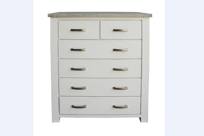 Crafted from acacia wood with a white wash finish, this fully assembled tallboy offers both style and convenience. It features six spacious drawers with elegant metal handles and smooth ball-bearing runners. The two-tone color scheme adds a touch of calm and style, making it a versatile choice to complement various home decor styles. With dimensions of W1000xD460xH1200mm, this tallboy is fully made up and ready to enhance your bedroom’s storage and aesthetics.