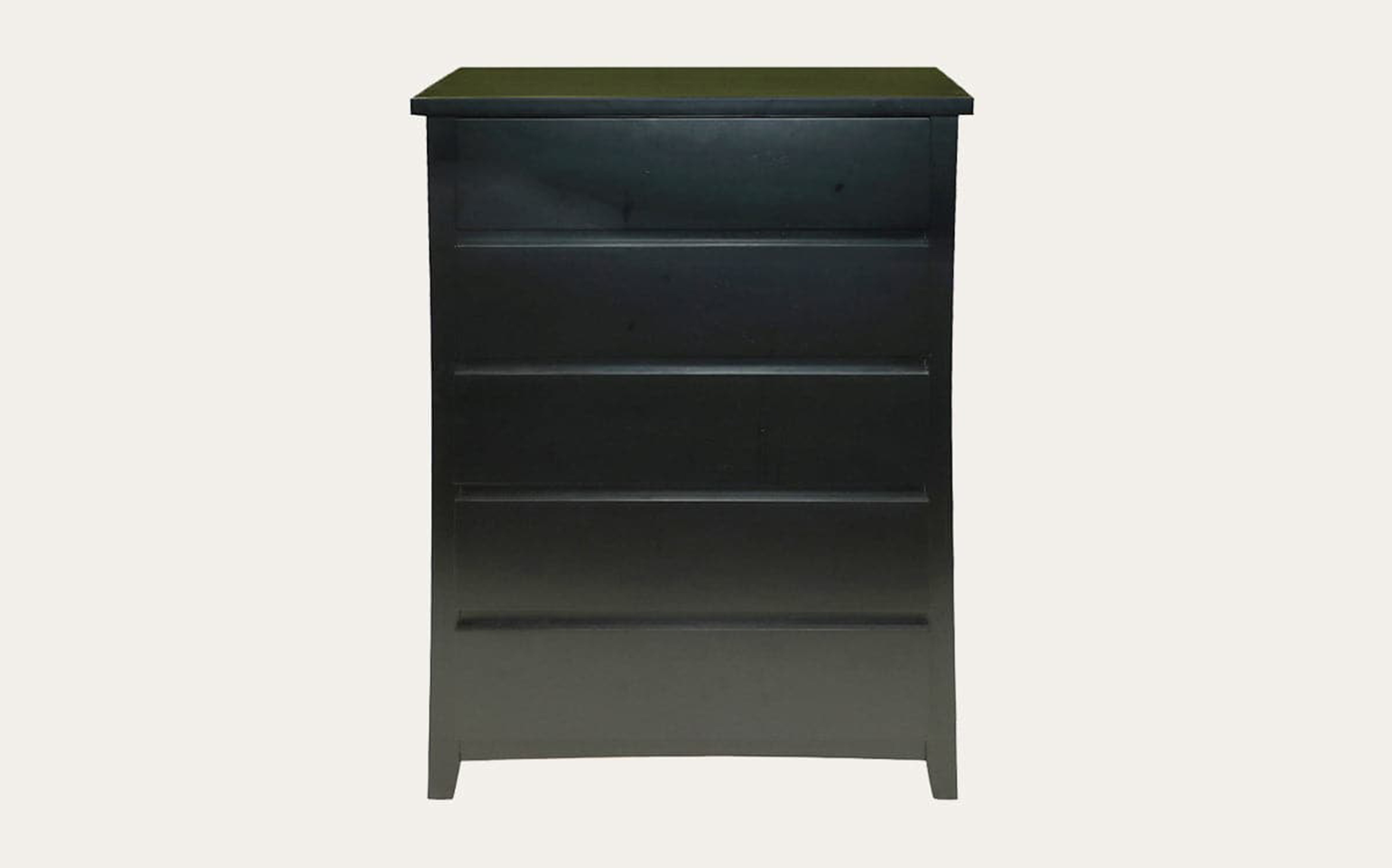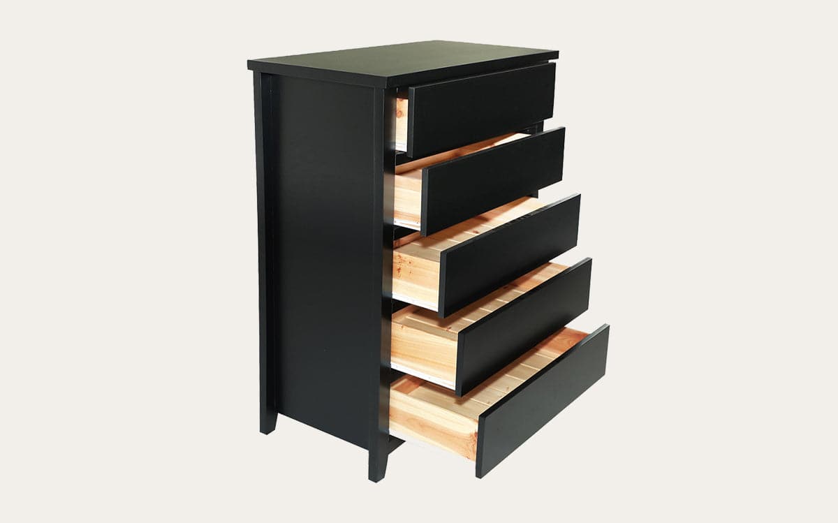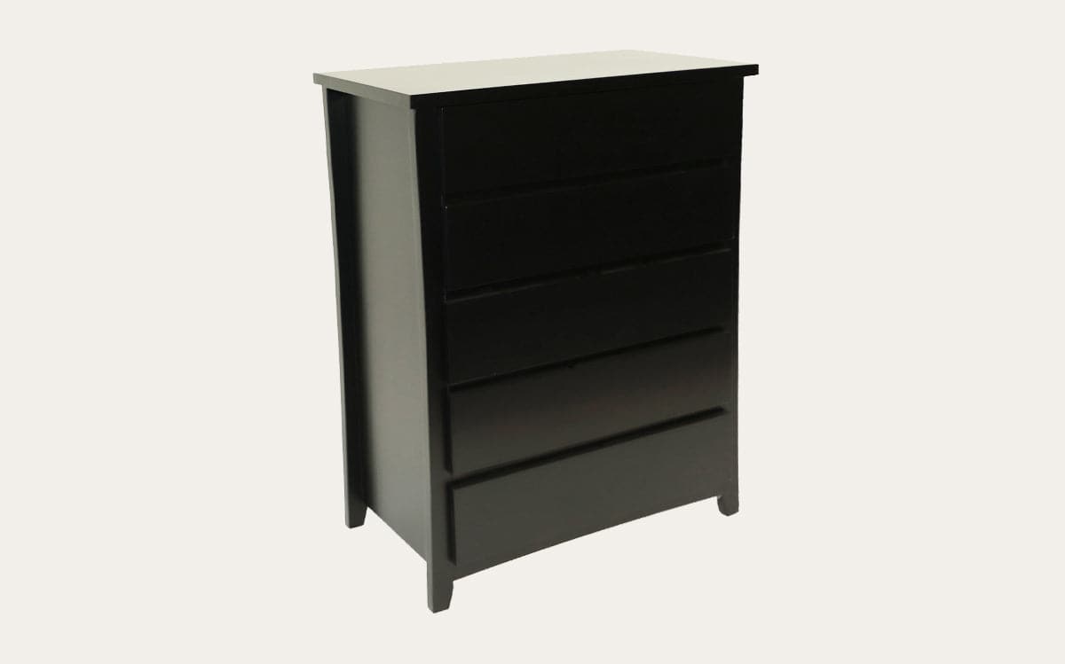 Introducing the Eboni 5-drawer tallboy in a sleek black finish, a stylish and practical addition to your bedroom. Crafted from solid timber, this tallboy offers ample storage with its five spacious drawers. The modern black design exudes a sense of sophistication and timeless charm, making it a versatile piece that complements various interior styles. Backed by a 1-year warranty, this tallboy combines durability, style, and practicality.