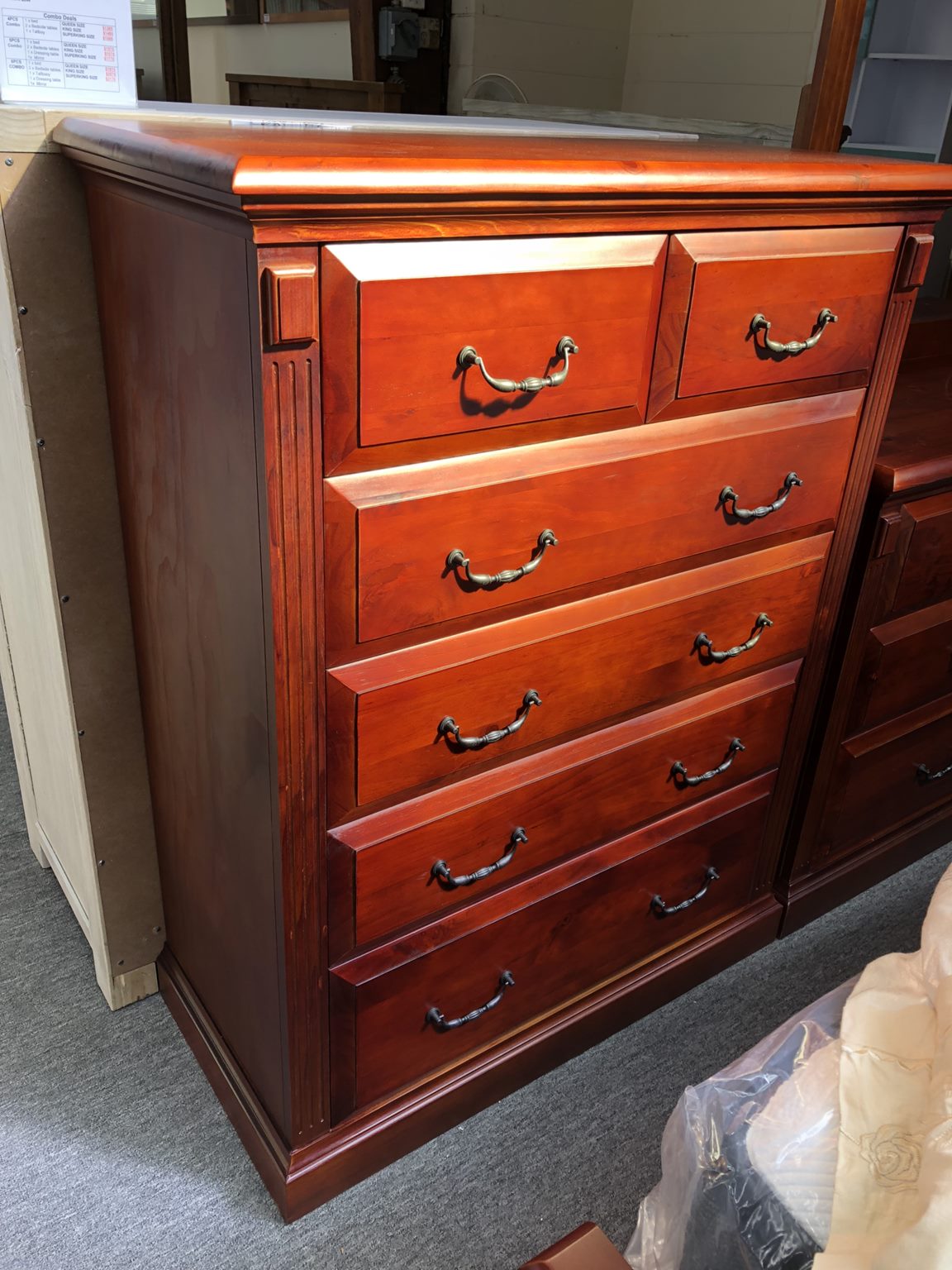 The bedside tables and tallboy, also made of solid pine wood, feature drawers with smooth metal runners, making them an excellent storage solution for your bedroom essentials. Inside the drawers, you’ll find solid pine wood construction, emphasizing the suite’s commitment to quality. With multiple size options available, you can choose the perfect fit for your space. Elevate your bedroom and enjoy both the aesthetic appeal and functionality of the Vina Style 4-Piece Suite.