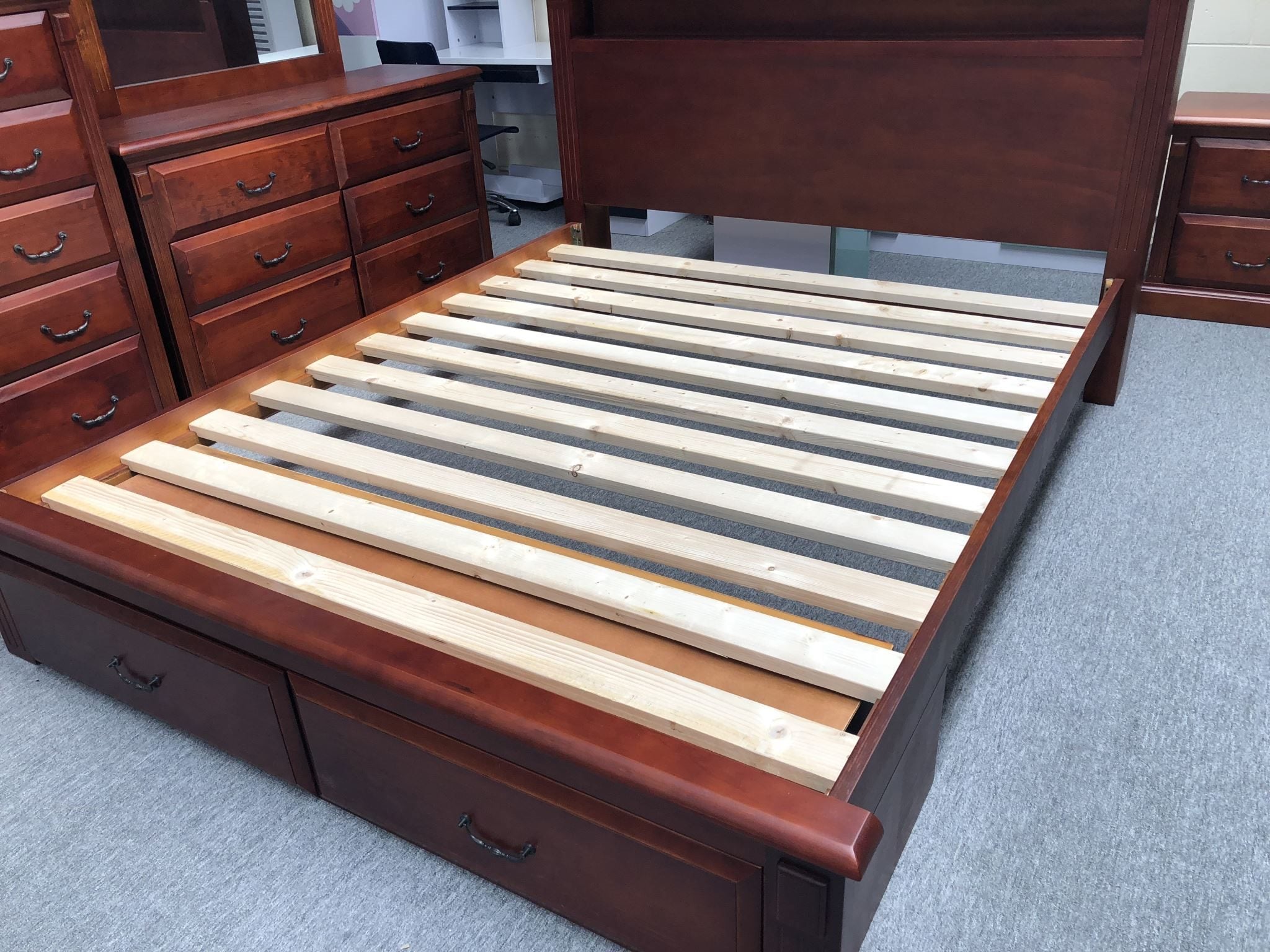 This comprehensive suite includes everything you need to upgrade your bedroom decor. The bed, crafted from solid pine wood, features two spacious drawers beneath the footboard for convenient storage and a built-in shelf on the headboard for extra display space. The durable metal bracket joinery ensures a strong and stable structure, and the solid 3cm-thick wooden slats provide additional support.